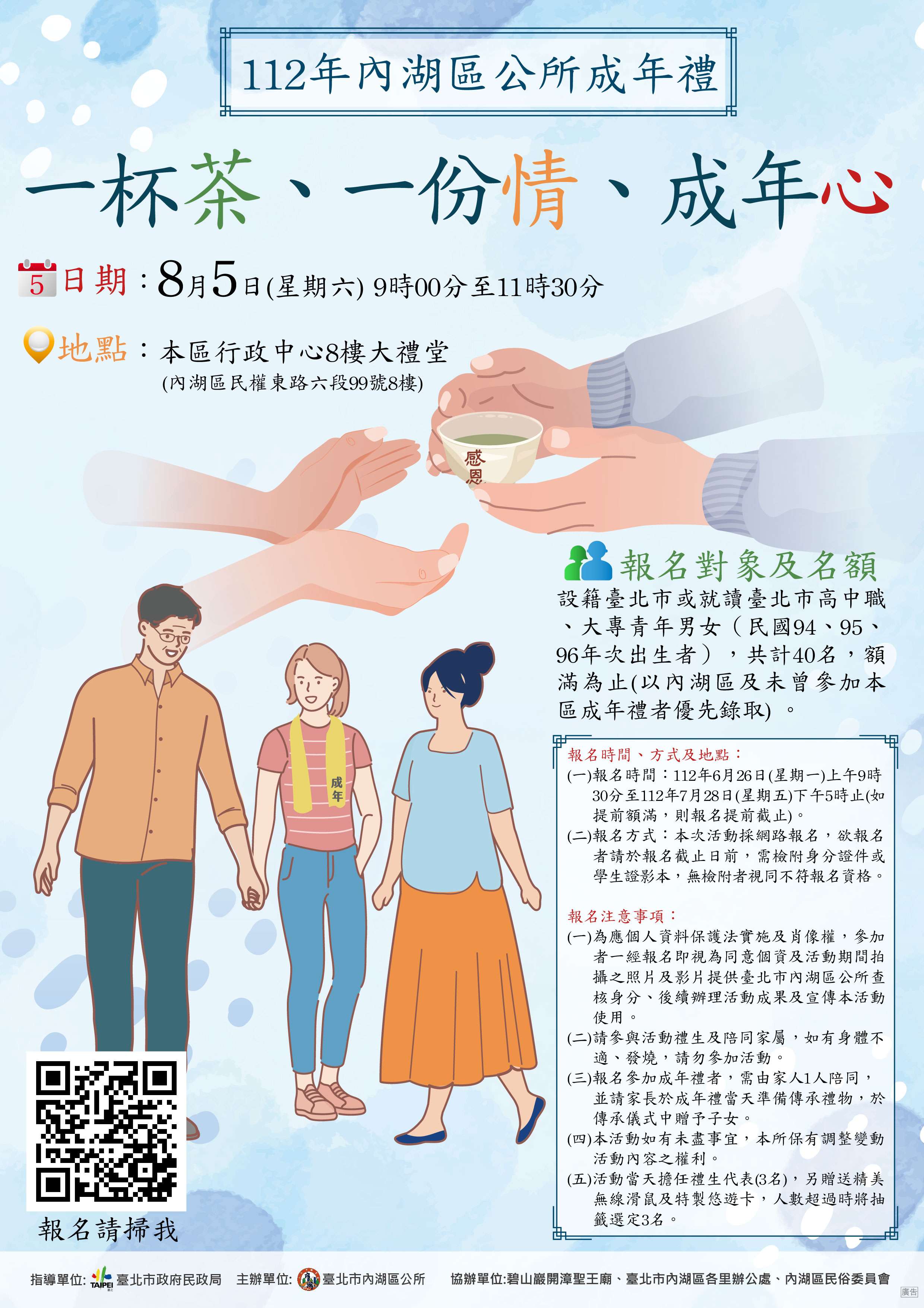 臺北市內湖區公所112年度 成年禮活動,訂於8月5日(星期六)上午9時舉辦,凡成功 報名並全程參與之禮生,可獲得成年禮紀念郵票、智慧 巾、茶具組及禮券600元各1份。活動內容包含茶道文化體 驗、穿越智慧門、行感恩禮及成年禮專屬拍貼機,即日起 開放報名,歡迎設籍或就讀於臺北市之青年男女(民國94 至96年次)踴躍報名參加,內容豐富,精彩可期。」