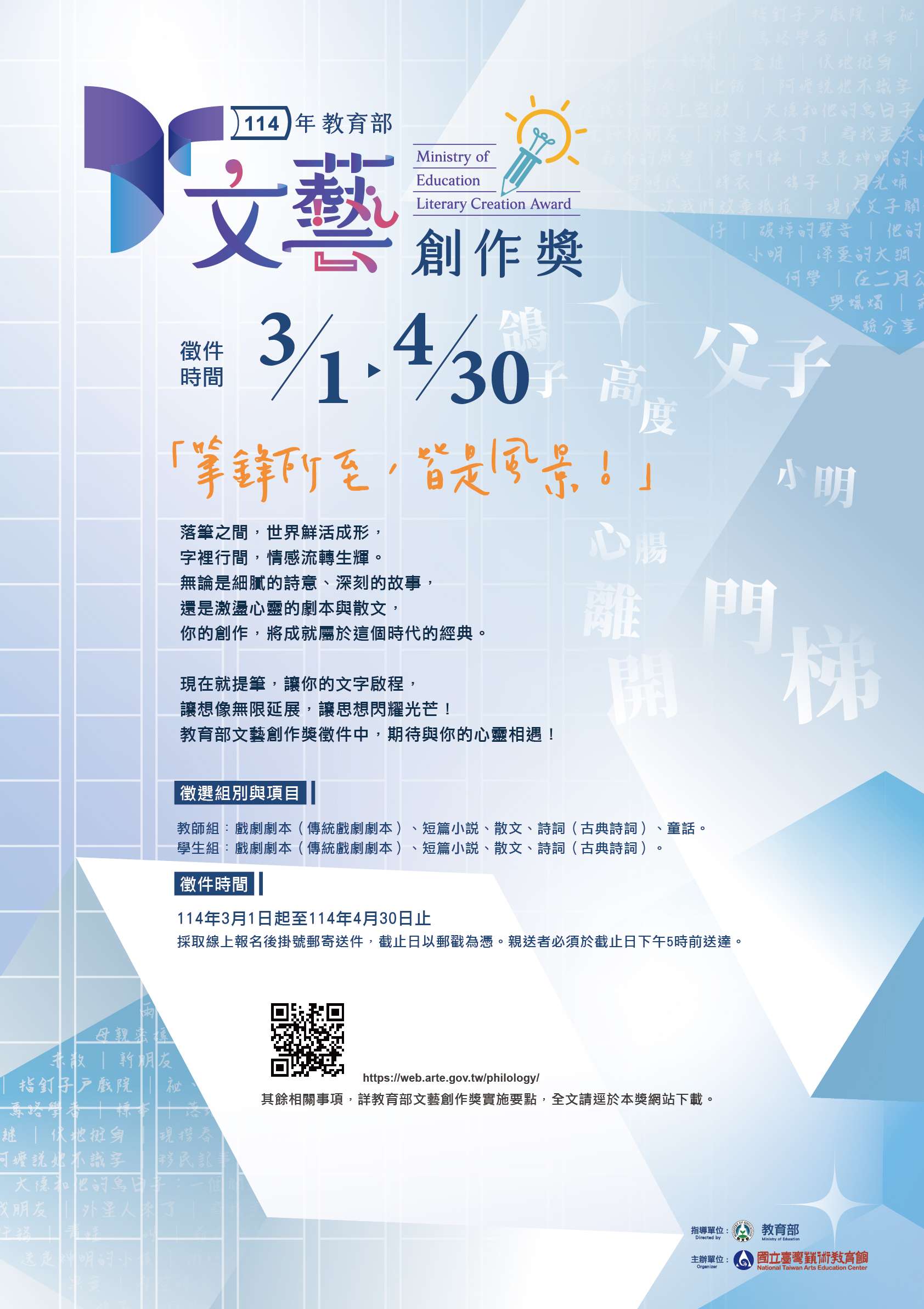注意事項:獲本獎特優者,次屆(即為次年)不得參加同 一項目。隔年次輪替徵賽之「傳統戲劇劇本」、「現代戲 劇劇本及兒童戲劇劇本」同屬戲劇劇本項下;「古典詩 詞」及「新詩」同屬詩詞項下。