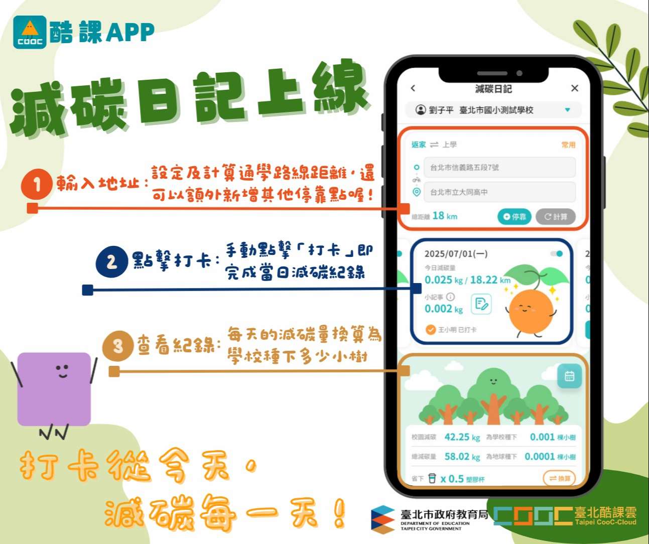 鼓勵學生或家長使用酷課APP「減碳日記」,透過每日打卡記錄減碳情形。