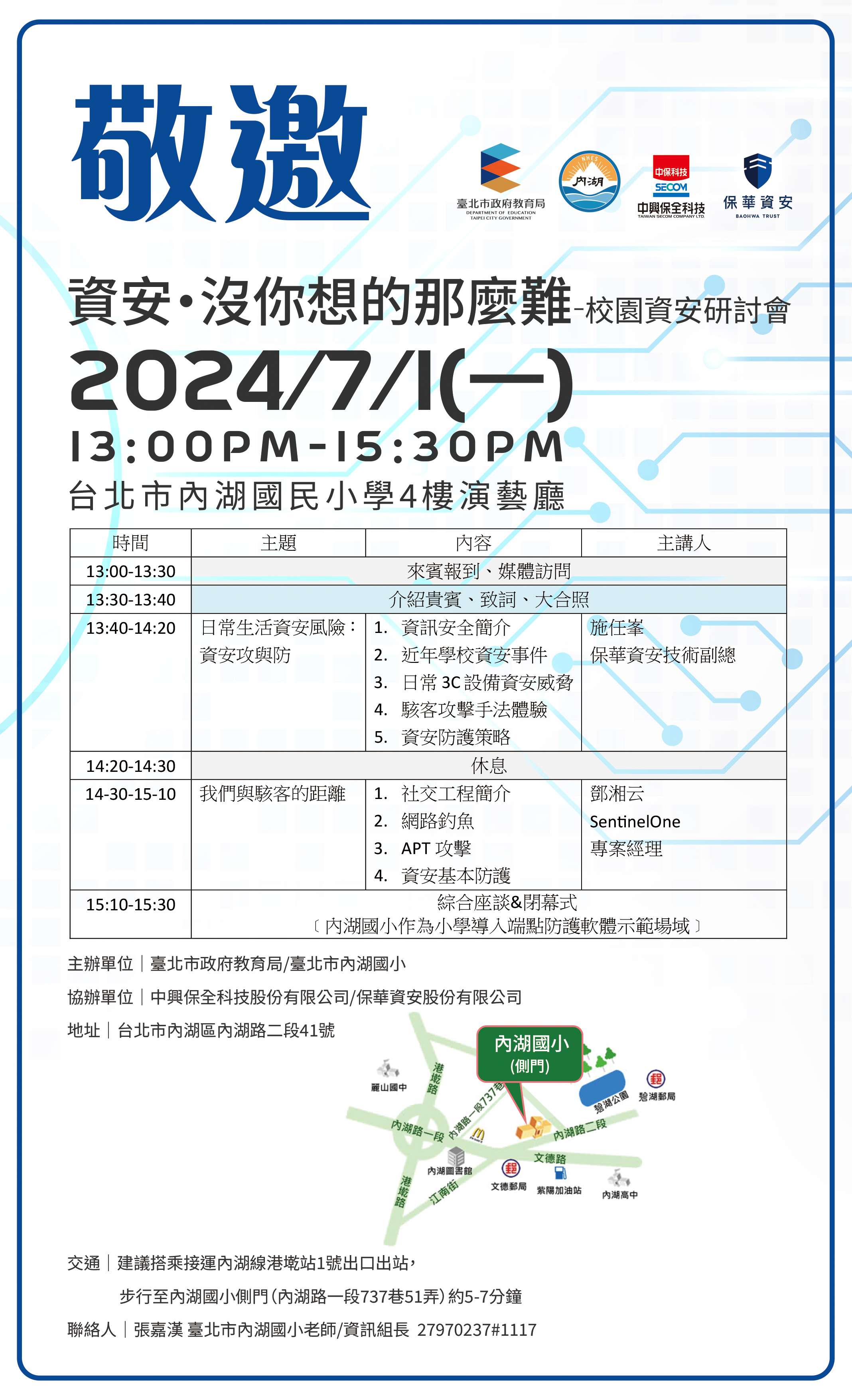 一、為因應數位科技的迅速發展,提升教師資訊安全知能,故 辦理此研討會,旨揭活動資訊說明如下: