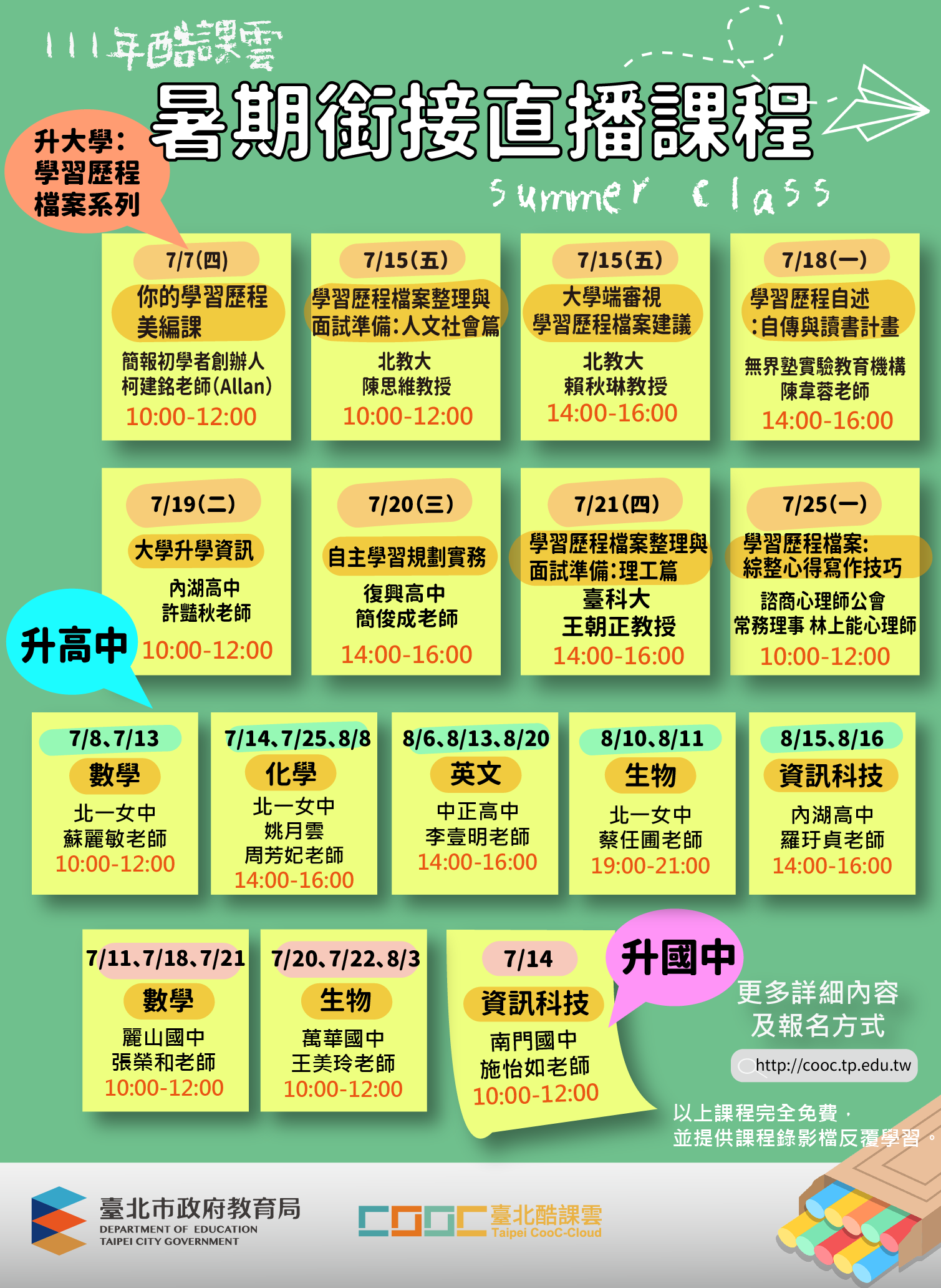 二、本課程實施時間自111年7月7(星期四)至8月20日(星期六)止,詳細科目及直播時間請參閱計畫(如附件),或於臺北酷課雲「酷課OnO線上教室」銜接課程專區(網址:https://ono.tp.edu.tw/)取得詳細資訊。