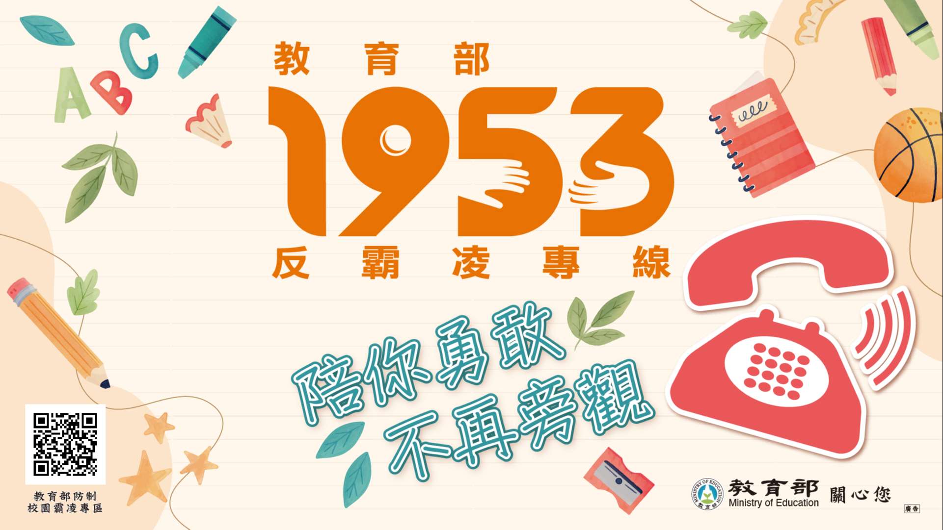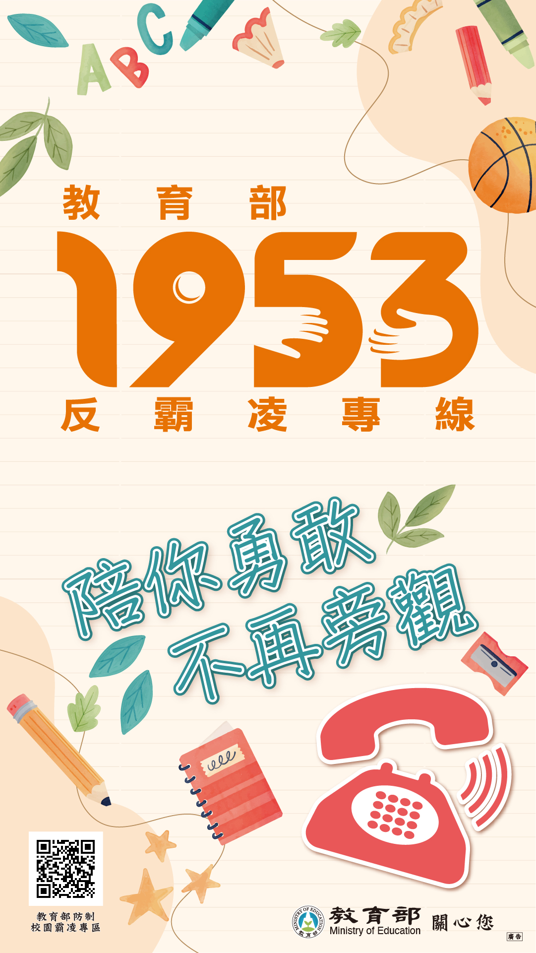 友善校園無界限,陪你勇敢,不再旁觀,教育部反霸凌專線 1953 自 111 年 8 月 30 日 正式啟用 24 小時專人接聽 提供諮詢 及通報管道 1953 carry你。教育部,關心您。