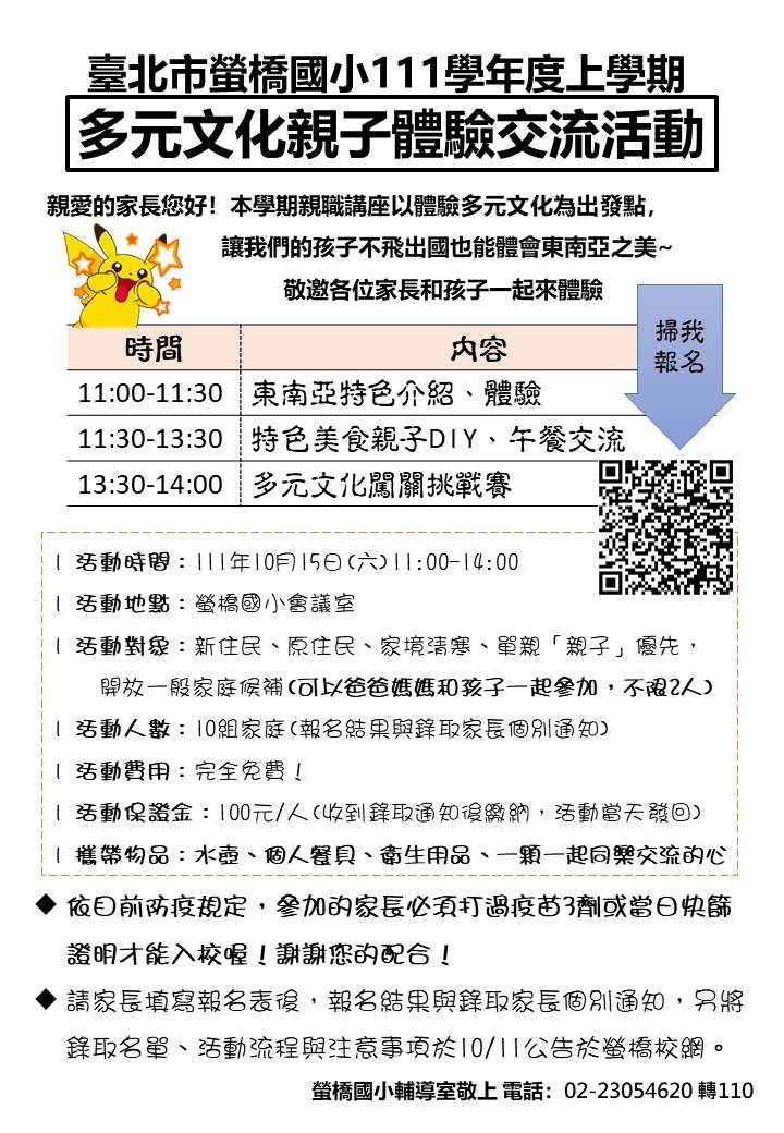 三、參加對象:臺北市國小學生,新住民、原住民、家境清 寒、單親「親子」優先,開放一般家庭候補(可以爸爸媽媽 和孩子一起參加,不限2人)