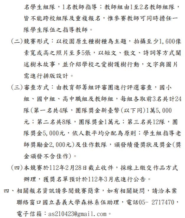 如有相關疑問,請洽本案聯絡窗口國立嘉義大學森林系伍 助理,電話05-2717470,電子信箱:as210423@gmail. com