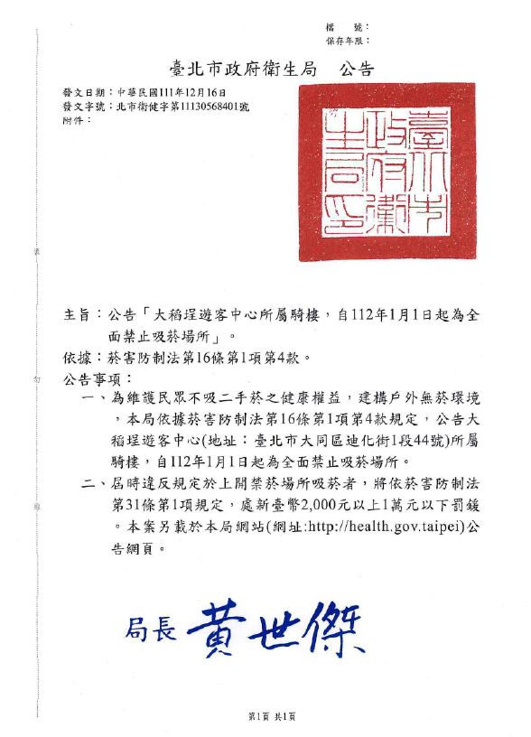 二、為維護民眾不吸二手菸之健康權益,建構戶外無菸環境,本局依據菸害防制法第16條第1項第4款規定,預定公告大稻埕遊客中心(地址:臺北市大同區迪化街1段44號)所屬騎樓,自112年1月1日起為全面禁止吸菸場所。