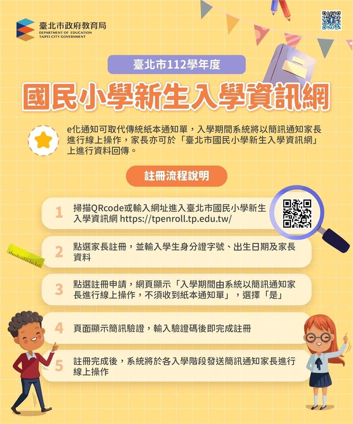 (四)若貴子弟擬就讀私立小學、遷居外縣市、移民或隨親就讀他校,請您務必填妥「112學年度學齡兒童入學通知單」內之「學齡兒童未就讀國小回條」,註明原因、簽名後於6/5(一)前親送、郵寄或傳真本校教務處(Fax:02-23057653)。或上網填寫未報到原因(https://forms.gle/BxPvQQ8Vi3aSgSyG6)