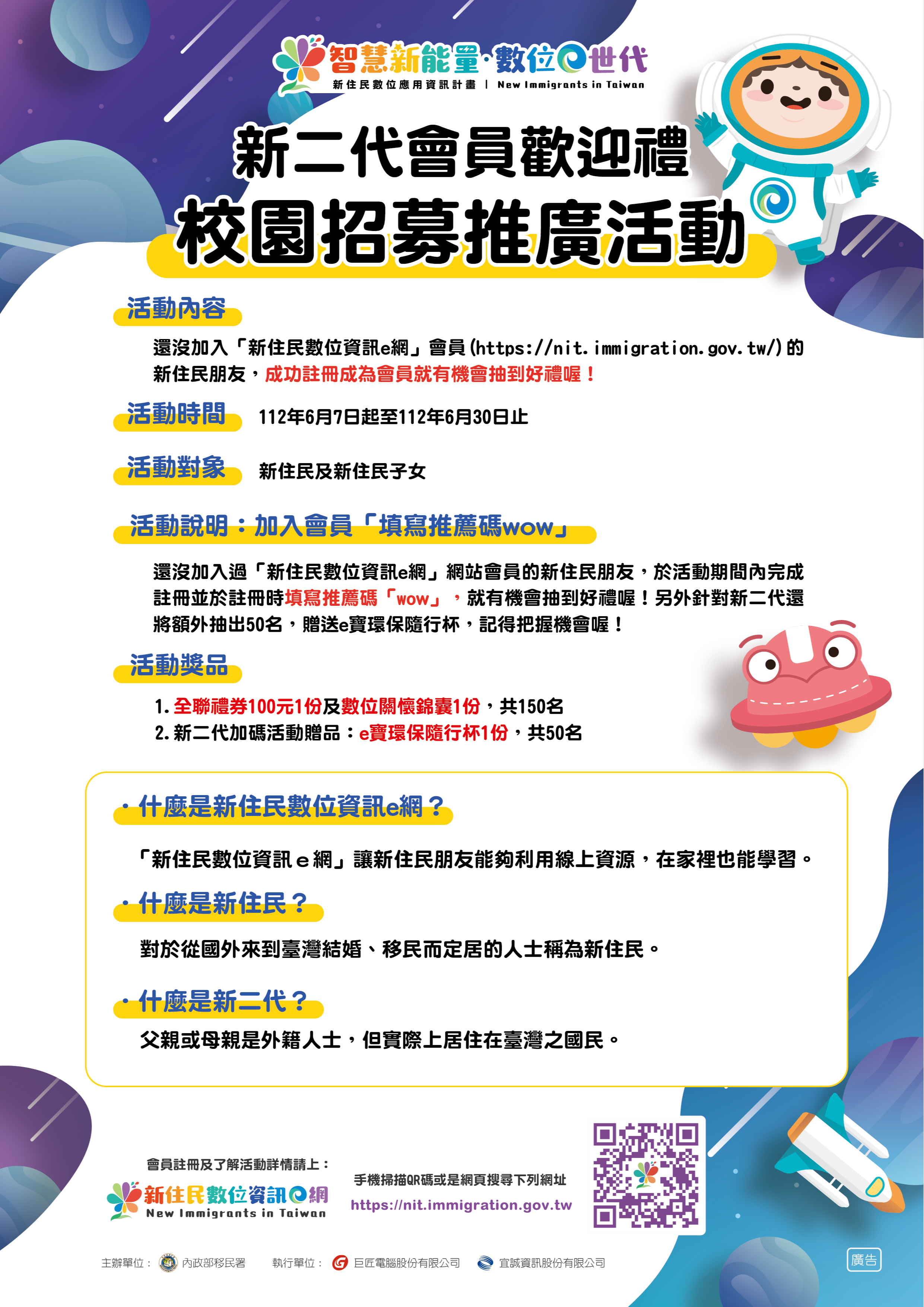 三、為廣邀校園之新住民及新住民子女踴躍參與學習,該署特 舉辦「新二代會員歡迎禮~園招募推廣活動」新會員註冊推 廣活動,活動期間自112年6月7日至112年6月30日止,活動 詳情請參閱新住民數位資訊e網公布欄。