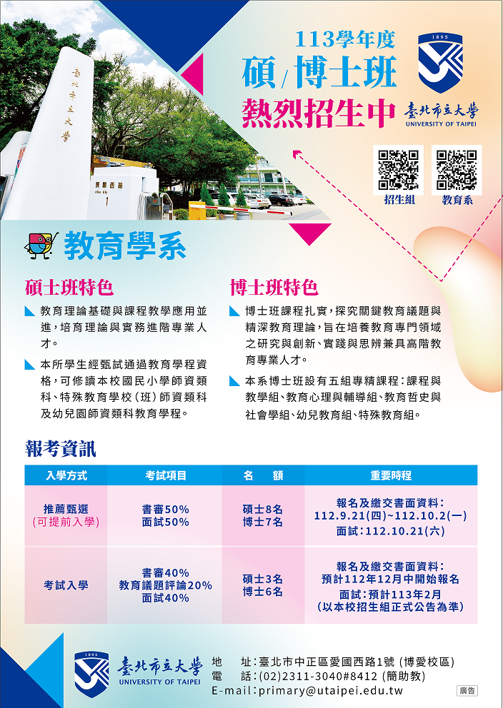 一、臺北市立大學教育學系承接師資培育與學術研究百年基業。碩士班招生8名;博士班設有五組專 精課程:課程與教學組、教育哲史與社會學組、教育心理 與輔導組、幼兒教育組與特殊教育組,合計招生7名。