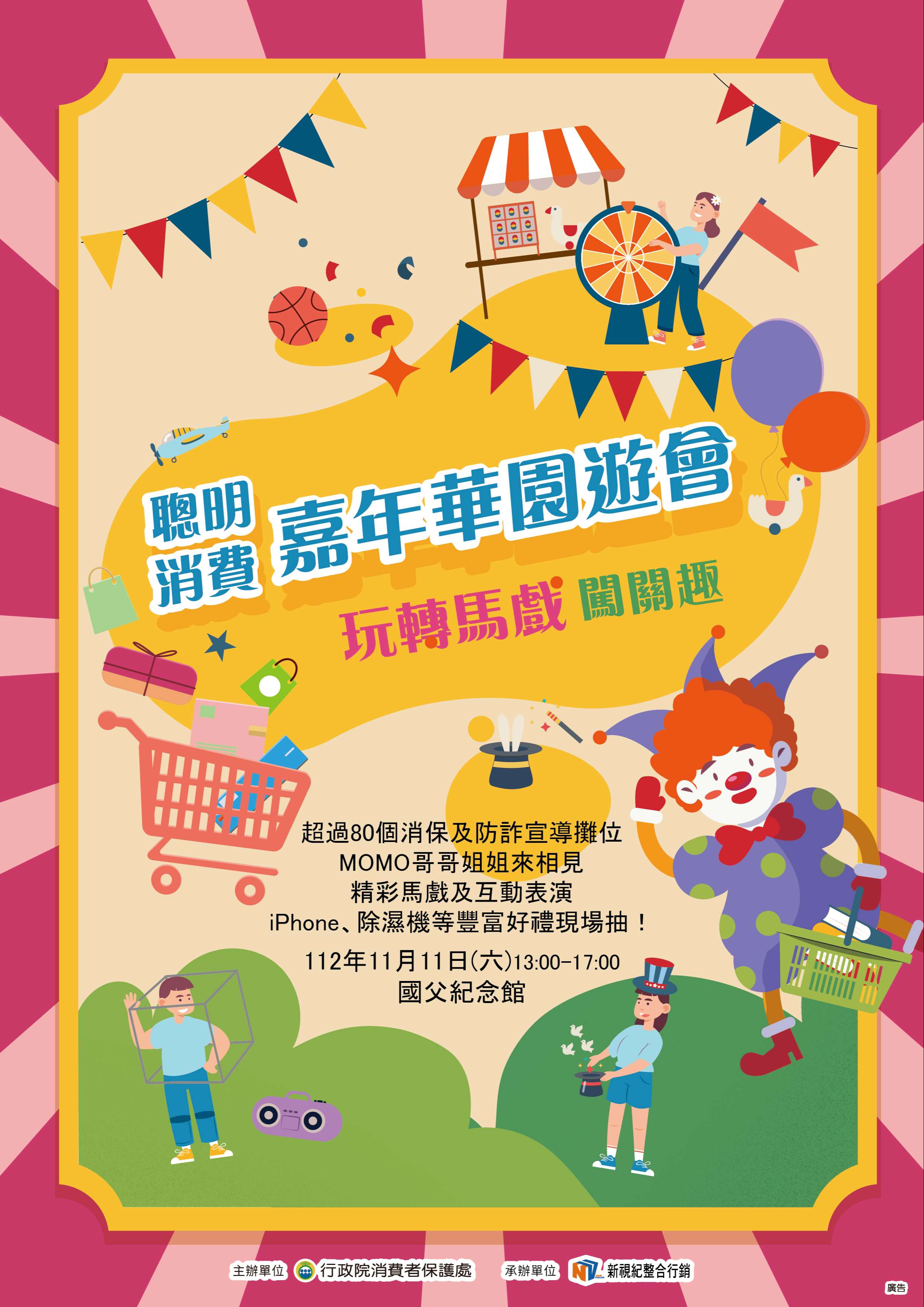 強化消費者自我保護知能,訂於112年11月11日(星期六)下午1時至5時於國父紀念館舉辦旨揭活動,除設有逾80個攤位供學習體驗與闖關抽獎外,並安排魔術、小丑表演與電視兒童臺哥哥姐姐唱跳、部會上臺秀等舞臺表演,透過寓教於樂方式,傳達重要消保與防詐觀念。
