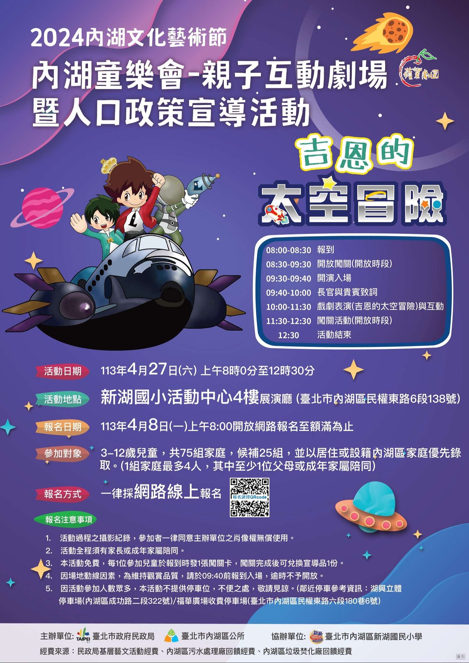 臺北市內湖區公所於4月27日(六) 8時 0分至12時30分,於臺北市內湖區新湖國民小學活動中心舉 辦2024年內湖文化藝術節「內湖童樂會-親子互動劇場」暨 人口政策宣導活動,當日邀請知名蘋果劇團表演「吉恩的 太空冒險」,現場還有4種各具特色的童玩闖關遊戲,歡迎 爸爸媽媽們帶寶貝「一起童樂」, 113年4月8日上午8時起 開放網路報名,額滿為止,名額有限,詳情請參閱內湖區 公所網站。報名網址:https://www.beclass.com /rid=284d7c165fb90c44e079。