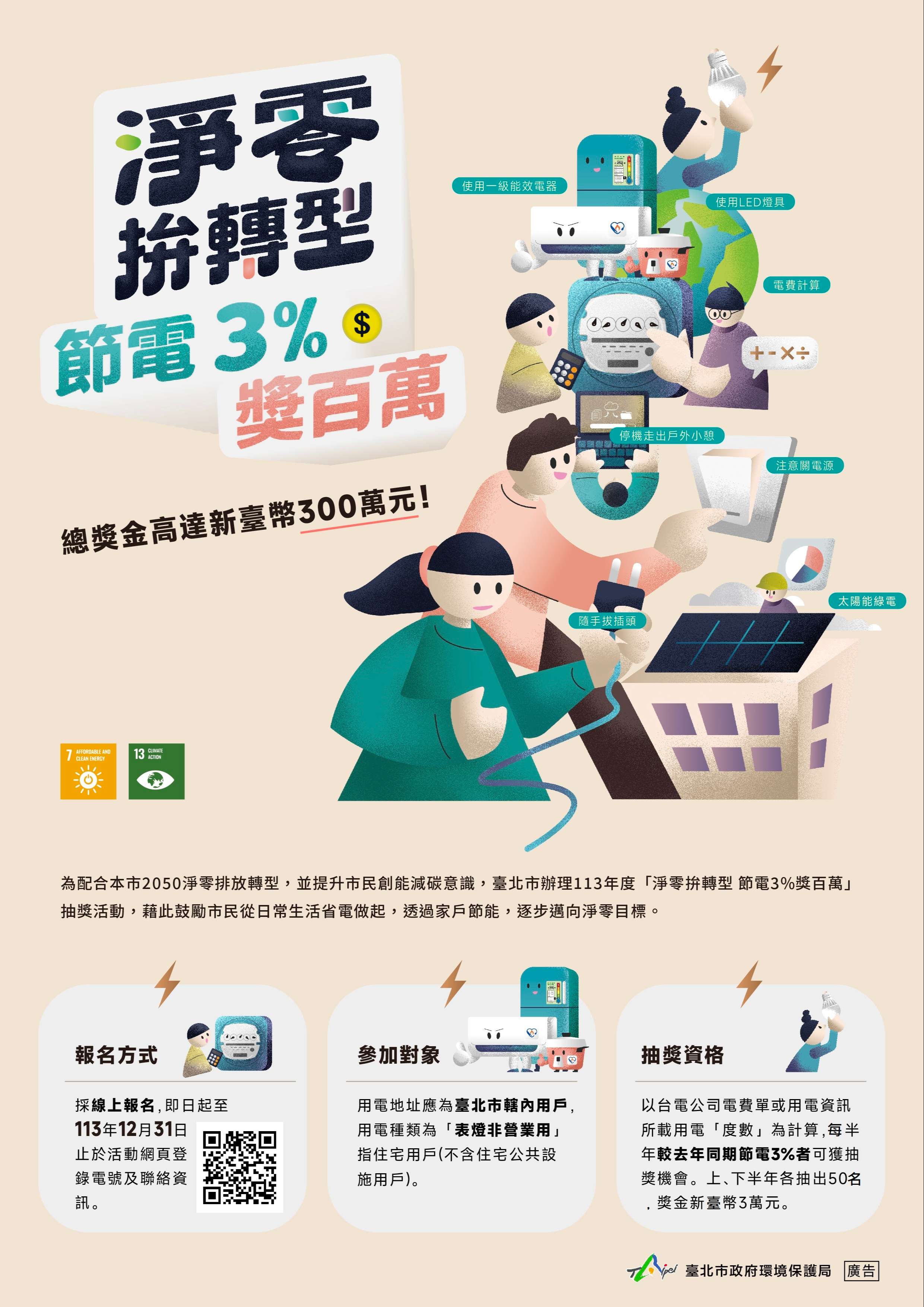 環境保護局為鼓勵市民落實節能減碳行動,即日起至113年12月31日辦理「淨零拚轉型節電3%獎百萬」抽獎活動,參加對象為臺北市轄內「住宅用戶」,每半年較去年