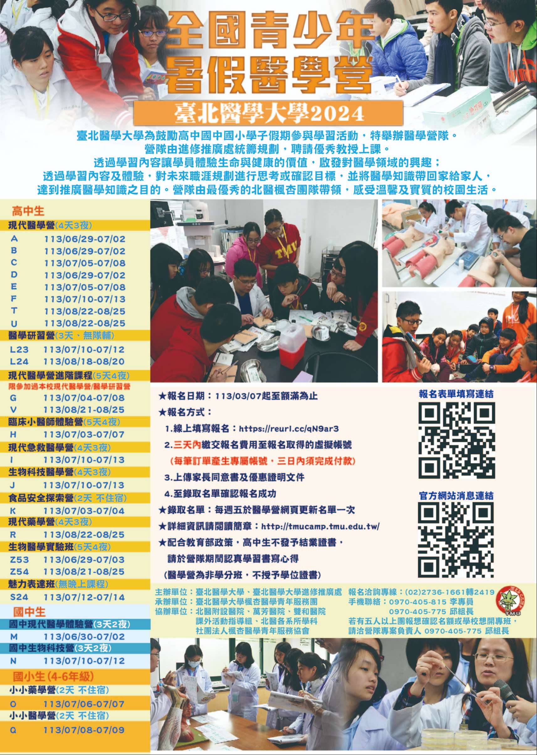 2024暑期醫學營擬訂於民國113年6月29日至8月25日辦理。網址 http://tmucamp.tmu.edu.tw/