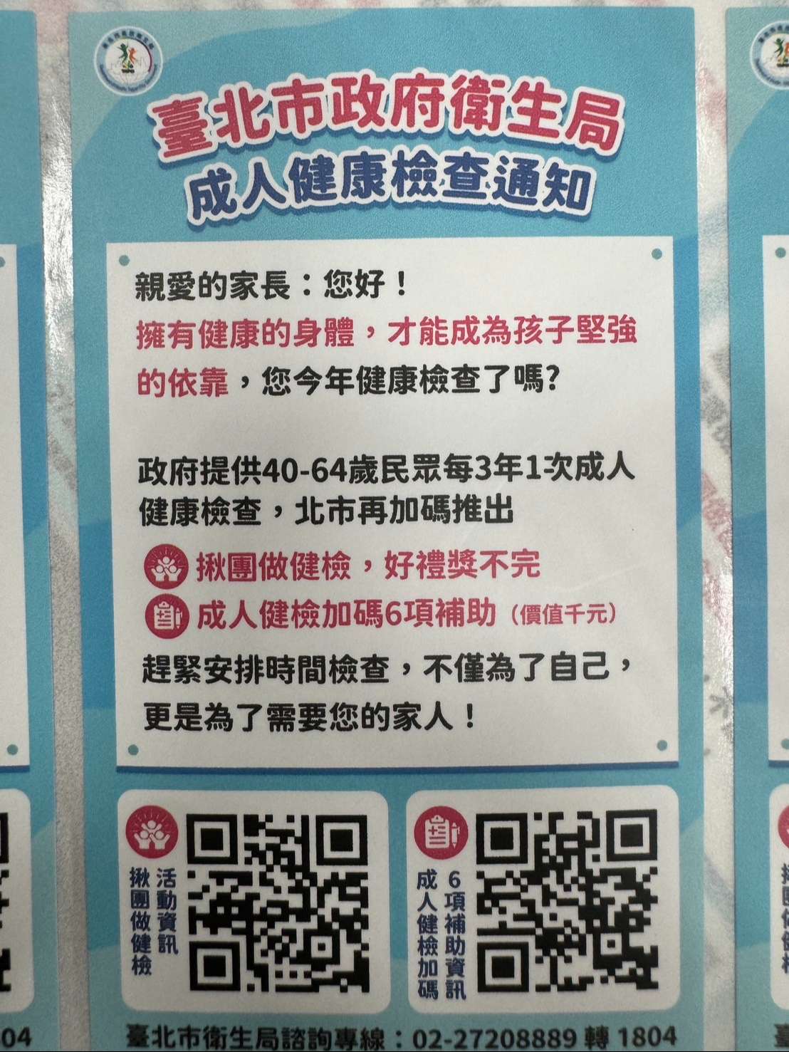 (二)「成人健檢加碼6項補助」活動:即日起至10月底止,設籍臺北市40歲至64歲民眾至臺北市立聯合醫院完成成人健檢,即可再免費享有尿素氮、尿酸、糖化血色素、全