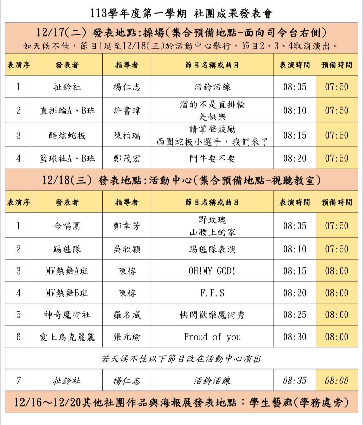 12/17(二)8:00,地點:操場(若下雨,扯鈴表演移至12/18活動中心表演。直排輪、蛇板、籃球社團表演取消)