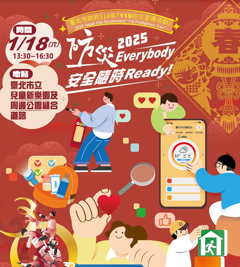 旨揭活動訂於114年1月18日(星期六)13時30分至16時30 分,假臺北市立兒童新樂園及周邊公園縫合道路舉行,藉 由防災園遊會方式,透過宣導攤位與民眾互動、傳達及教 導民眾家庭防災之觀念,以提升民眾居家生活安全。