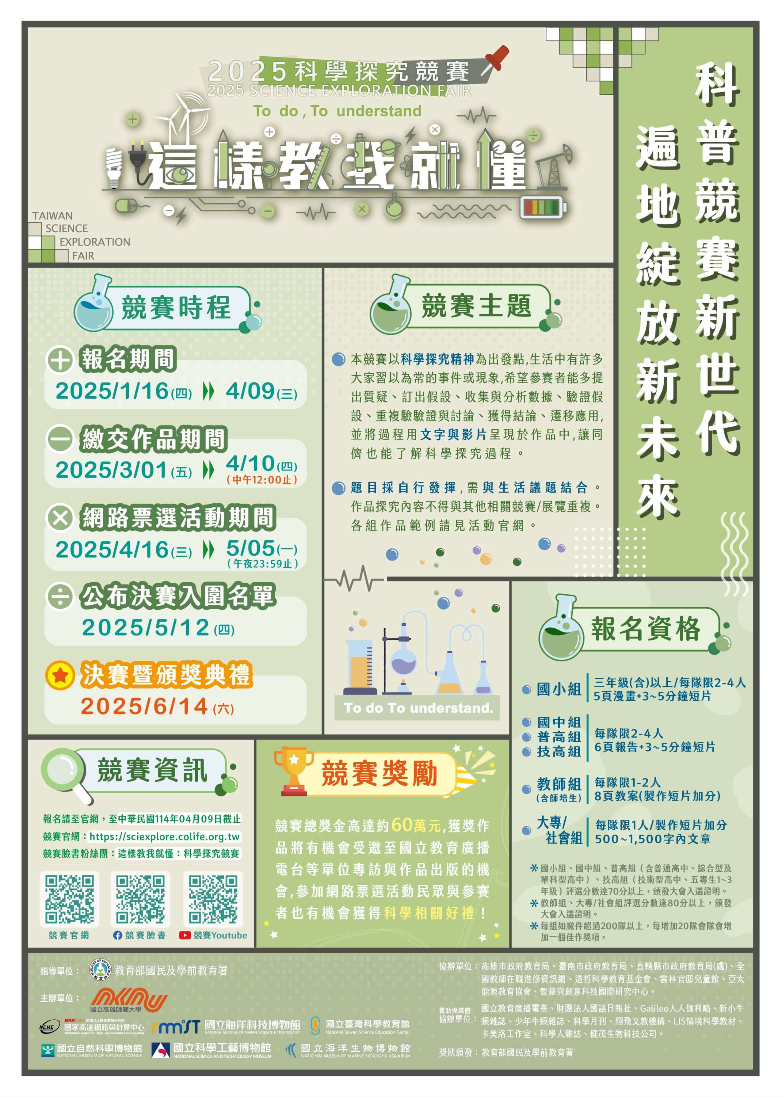 2025年「科學探究競賽-這樣教我就懂」科普競賽活動,相關資訊請參閱官網。