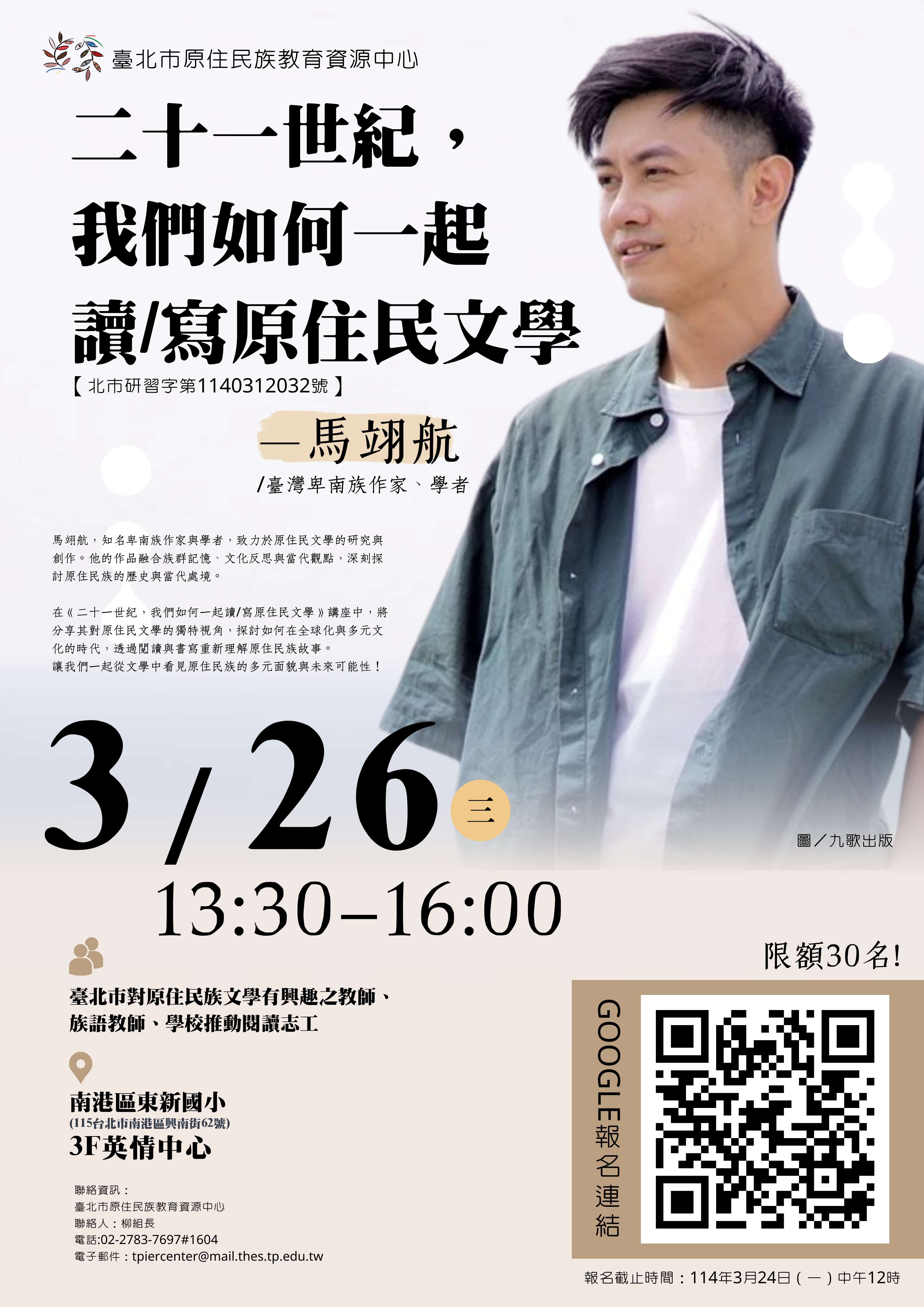 (六)研習對象:臺北市公私立國高中、小學教職員、對原住民族文學有興趣之人員、族語教師、學校推動閱讀志 工。