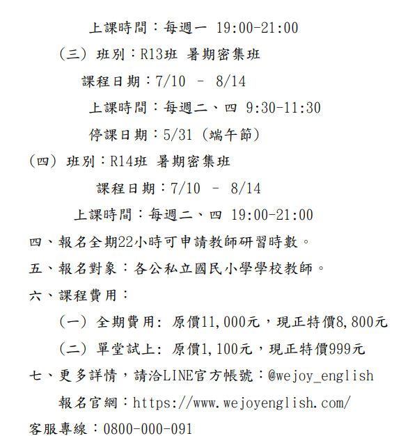更多詳情,請洽LINE官方帳號:@wejoy_english 報名官網:https://www.wejoyenglish.com/