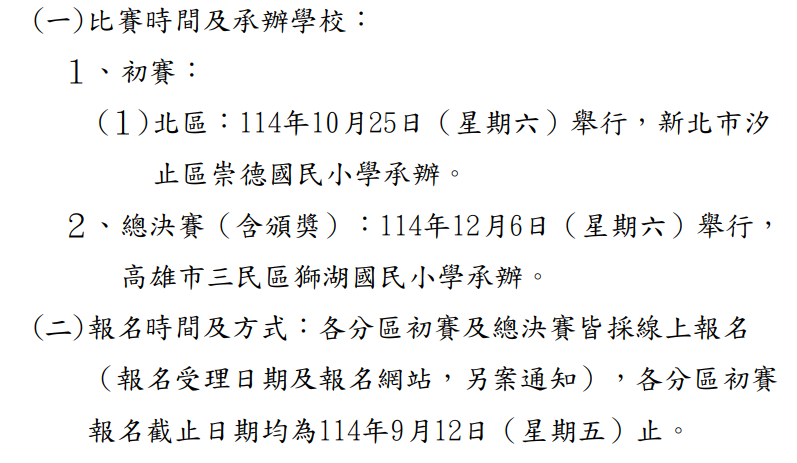 北區初賽原訂114年10月25日(星期六)辦理,因 故調整至114年10月18日(星期六)舉辦