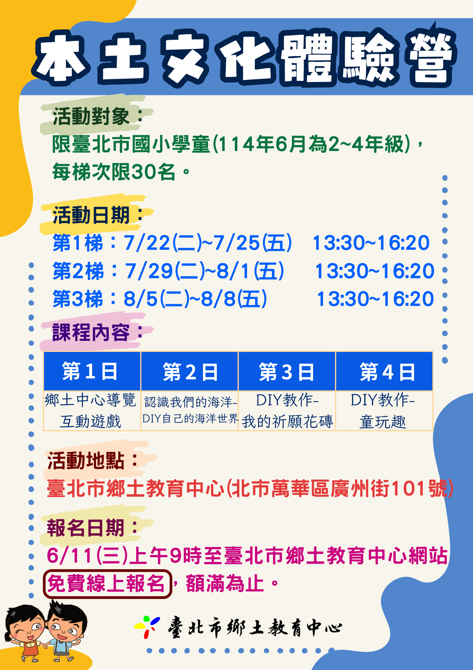 本營隊活動課程內容豐富多元,有關詳細課程內容、報名 方式請詳見活動計畫或至臺北市鄉土教育中心網站 (http://hcec.tp.edu.tw)查詢。
