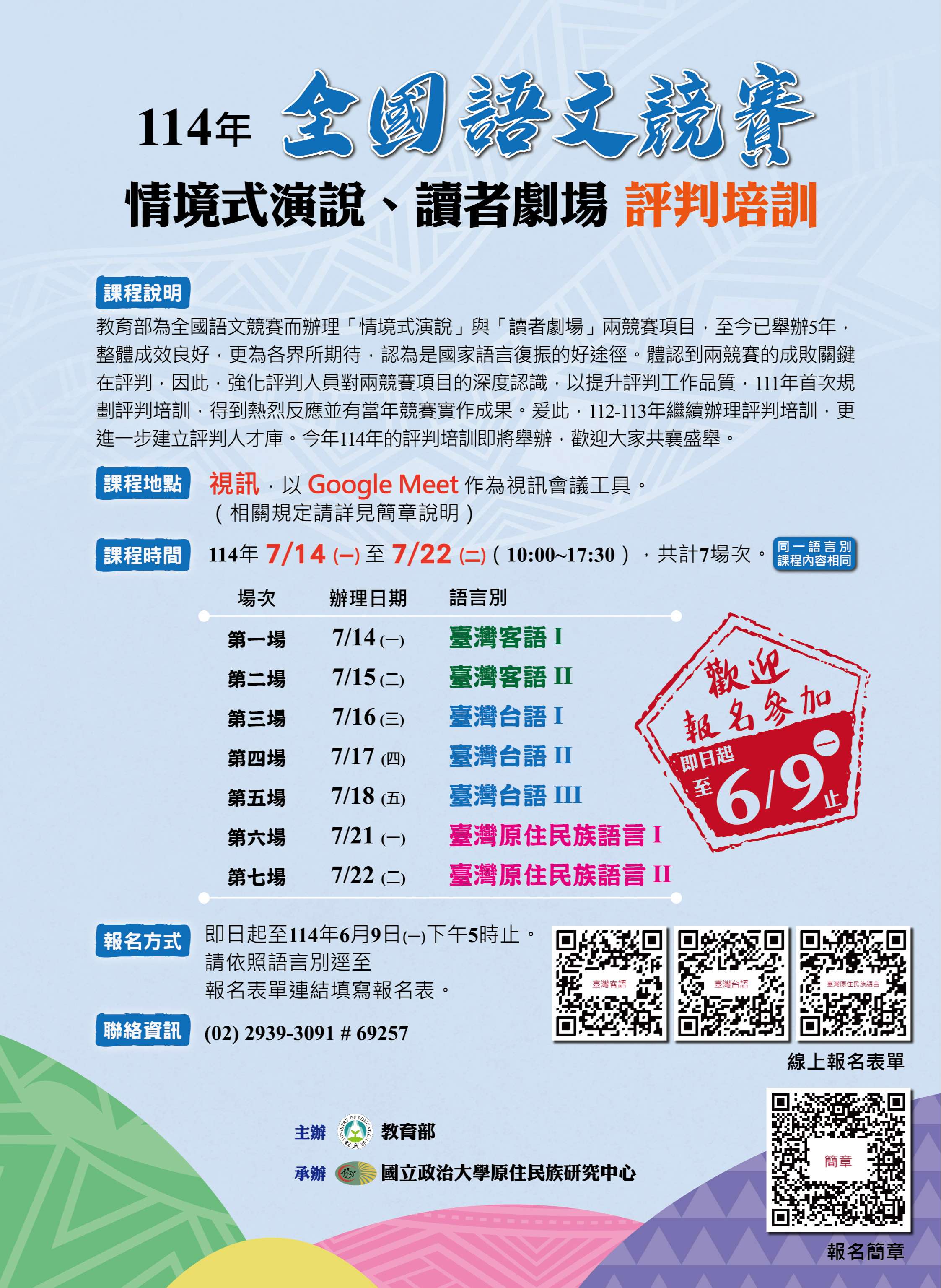(三)培訓時間及場次:自114年7月14日(星期一)至7月22日 (星期二),臺灣客語2場,臺灣台語3場及臺灣原住民 族語言(不分民族語言別)2場,共計7場。