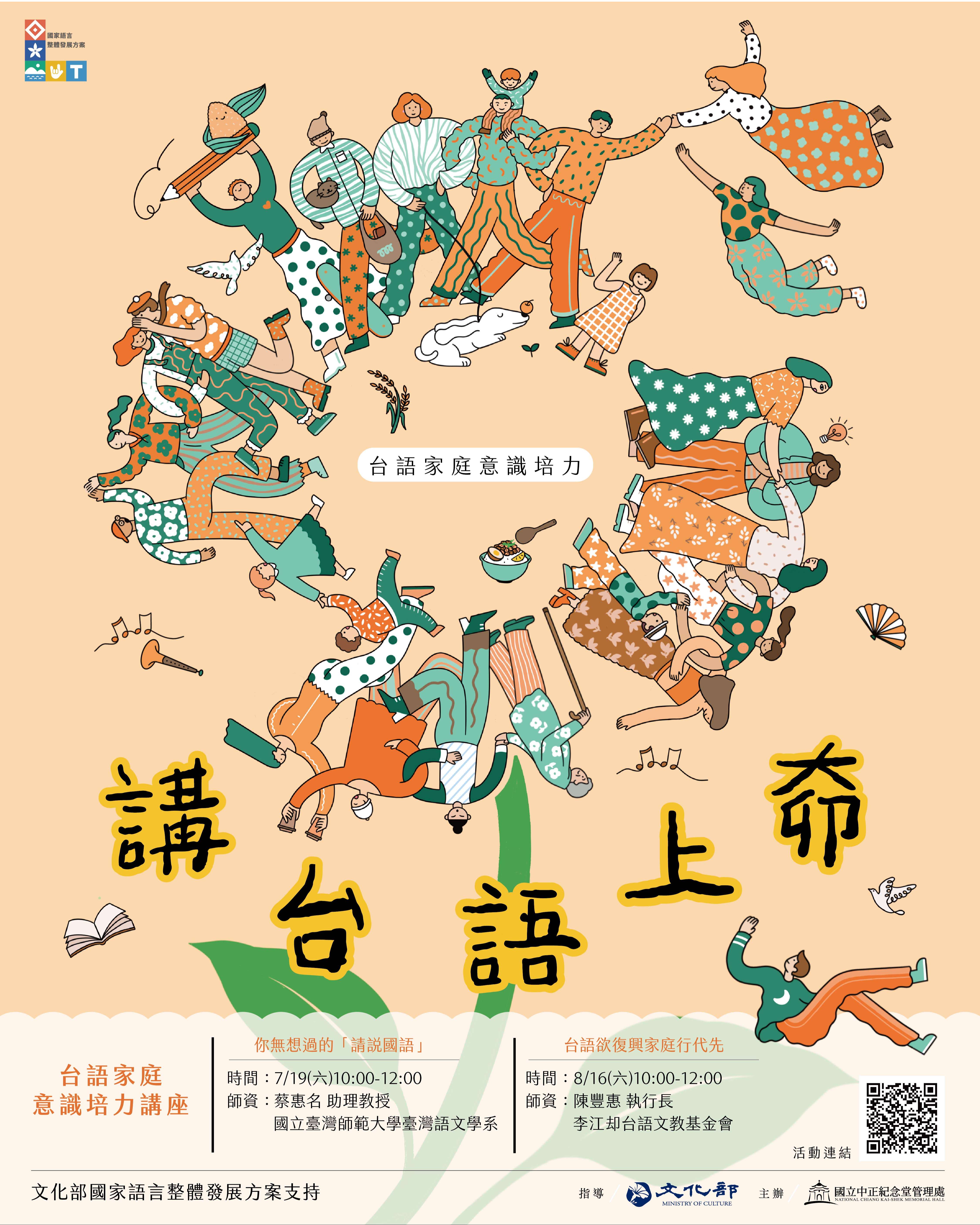 各課程配合文化部「培育台語家庭計畫」集點,歡迎台語 家庭參與學習;且講座課程可依參與時數核發公務人員終 身學習時數,詳情請洽國立中正紀念堂管理處官網 (https://www.cksmh. gov.tw/),查詢路徑如下:官網/ 推廣教育/國家語言推廣活動。