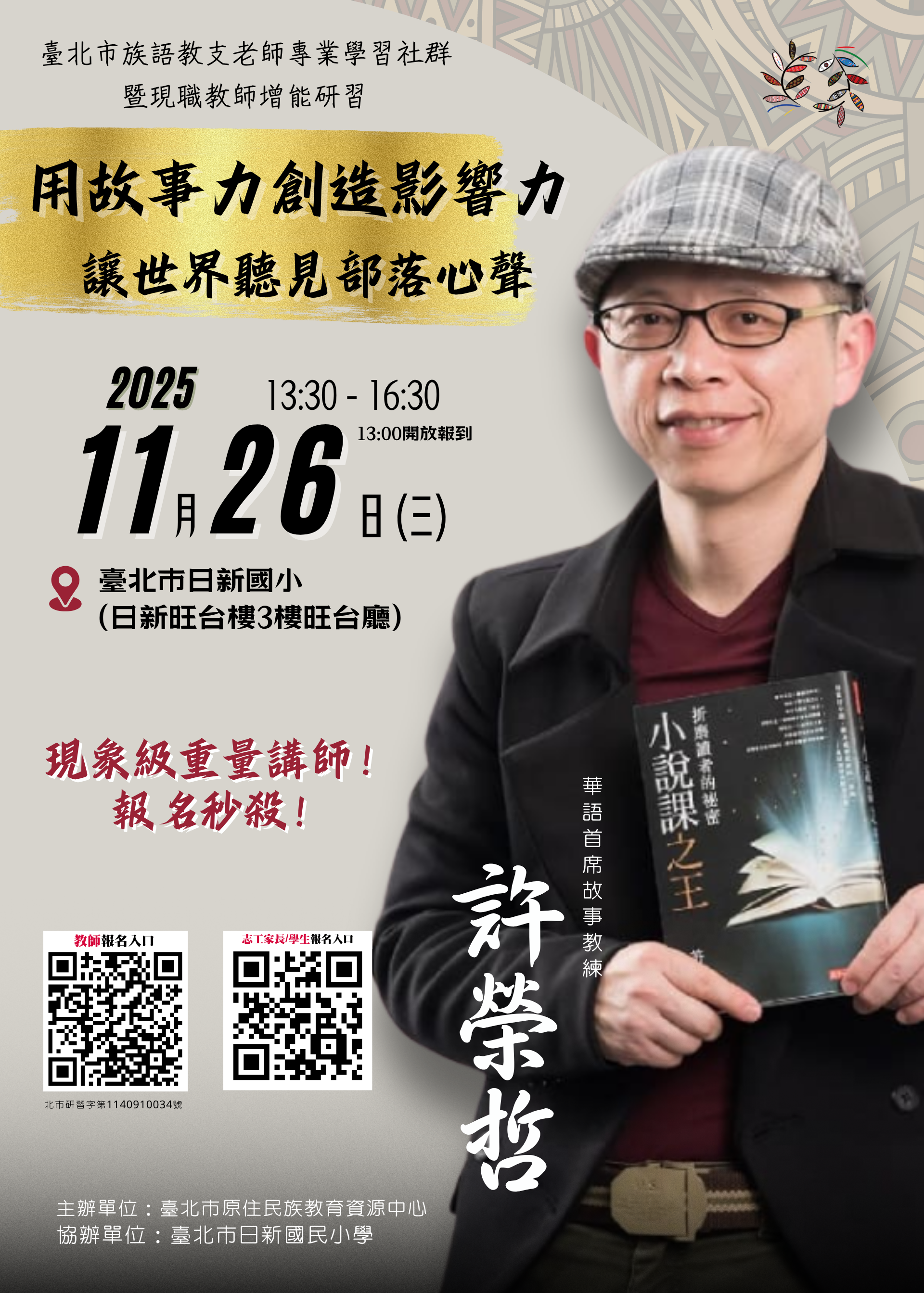 (五)參加對象:對「故事力」教學與原住民族教育有興趣之 本市各級學校現職教師、本土語老師(含支援教師)、 志工家長及師培學生等。