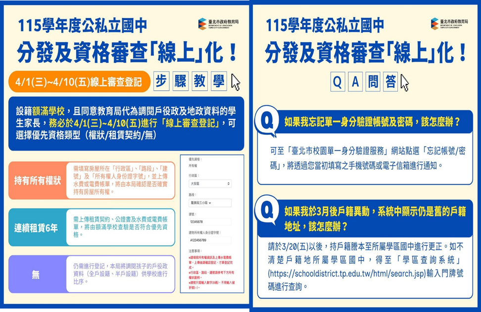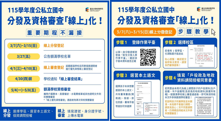 「115學年度臺北市公立國中分發及資格審查」全面線上化!透過「新生分發入學作業平臺」 https://newstd.tp.edu.tw/Login.action ,從分發登錄、資格審查到後續報到,皆可採線上方式辦理,在家即可完成重要入學程序,省時又便利✨
